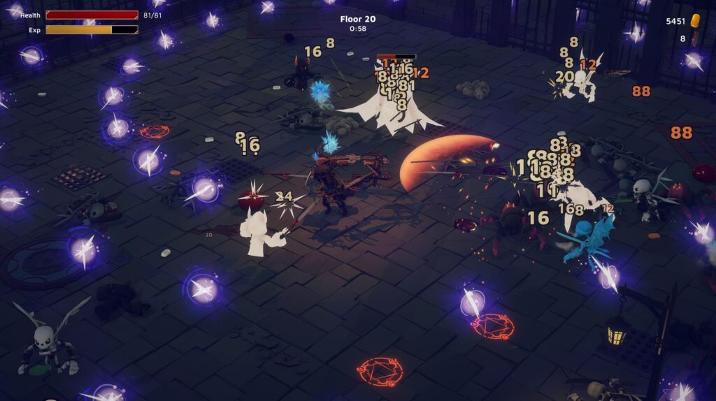 O jogador pode montar diversas builds (construções), como com foco em dano por segundo, veneno, explosão, alcance, velocidade, ou efeitos passivos, como sangramento.