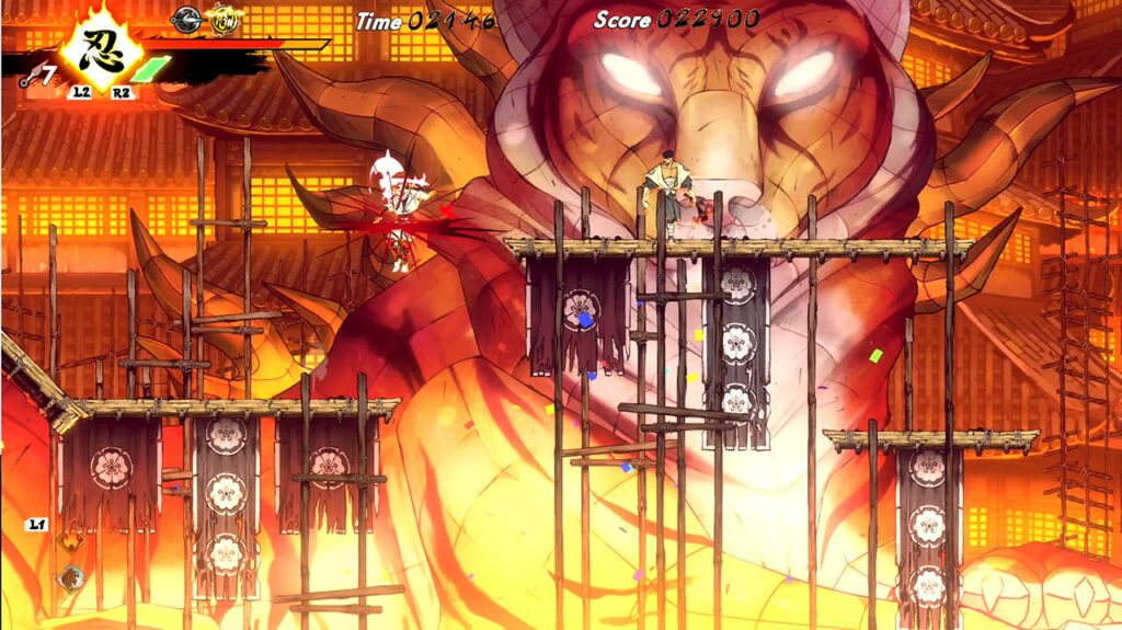 Por último, temos os Ninjutsus, e essas também são habilidades a serem desbloqueadas com o avanço do jogadores através da exploração e derrota dos chefes. Os Ninjutsus são habilidades que causam dano massivos em todos os inimigos da telas. Tais habilidades são equipadas no menu e utilizam a barra de fúria que é carregada ao tomar dano ou recolhendo essência de inimigos derrotados. O Karyu por exemplo, invoca dragões de fogo, causando dano massivo em todos inimigos da tela, o Shisui invoca uma deusa e ela recupera bastante a vida do personagem, e existem outros tipos que desbloqueamos ao avançar na história.
